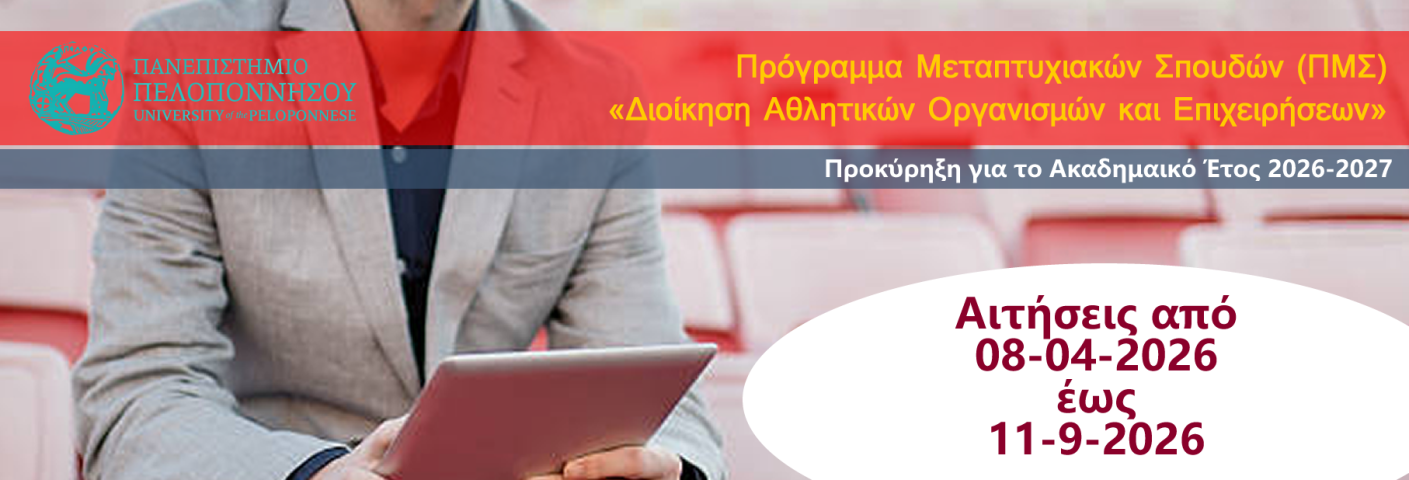 Το Τμήμα Οργάνωσης και Διαχείρισης Αθλητισμού του Πανεπιστημίου Πελοποννήσου παρέχει τις απαραίτητες γνώσεις, δεξιότητες και εμπειρίες στους φοιτητές και τις φοιτήτριες σε θέματα που άπτονται της οικονομίας και της διοίκησης του αθλητισμού. Είναι στελεχωμένο με αξιόλογα μέλη Διδακτικού και Εργαστηριακού προσωπικού, καθώς και βοηθούς ερευνητές, προκειμένου να υποστηρίξει επαρκώς τις διαδικασίες εκπαίδευσης και κατάρτισης των φοιτητών/φοιτητριών, συνδυάζοντας τη θεωρητική γνώση με την πρακτική της εφαρμογή σε σύγχρονες αθλητικές εγκαταστάσεις. Παράλληλα, δίνει τη δυνατότητα στους φοιτητές και τις φοιτήτριες να διοργανώσουν και να παρακολουθήσουν αθλητικά δρώμενα, επιστημονικά συνέδρια αλλά και να συμμετάσχουν σε δράσεις των Ερευνητικών Εργαστηρίων που λειτουργούν εντός του Τμήματος.